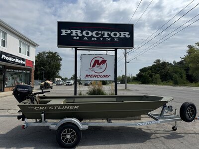 2025 Crestliner 1546 Retriever Jon. Powered by a Mercury 25 ELHPT EFI Four Stroke and packaged with a galvanized Karavan bunk trailer. In stock...