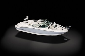 Notable upgrades include: Snap-in cockpit carpets, Premium bucket seats with sliders and flip-up bolsters, premium woodgrain steering wheel, Garmin fish finder and a spare tire for the trailer. A Sunbrella bimini top is also included as well as a Sunbrella bow cover and cockpit cover.