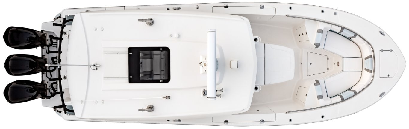 80 Gallon In-Floor Cockpit Fish Boxes Port and Starboard with Overboard Discharge Pumps Aft Facing Bench Seat with Stainless Steel Drink Holders and Removable Tackle Box Storage Battery Switch Panel Mounted in Helm Seat Base Bow Cushions - Removable Bow Floor Storage with Fiberglass Lid Carry-On Cooler (Yeti) under Aft Facing Seat (65 Quart) (not available with Wetbar Option) Cockpit and Bow Coaming Bolsters Cockpit Courtesy Lights - Blue LED Cockpit Table and Bow Filler Cushion with Dedicated Storage Diamond Lustre Non-Skid Surfaces Full Transom Seat Folds Flush into Transom Wall with Fiberglass Cover Hatch Interior Color Packages: Harbor Atlas Blue, Harbor Black, Harbor Blue, Harbor Gray, Harbor Ice Blue, Harbor Steel Blue, Harbor Mist, Shadow, Sand or Dune Large Port and Starboard Side Rod Storage Compartments with Lockable Fiberglass Lids Molded Bow Storage Compartments with Solid Surface Countertops, Three Drawer Storage and Trash Receptacle Molded Storage Compartments Under Port and Starboard Bow Deck Hatches Port and Starboard Cockpit Side Entry Door with Custom Stainless Steel Frame and Hardware Premium Stain Resistant Silicone Cockpit Fabric Self-Bailing Cockpit with Overboard Drain System Stainless Steel Drink/Rod Holders in Gunnel (4) Stainless Steel Drink/Rod Holders On Aft Cockpit Wall (2) Stainless Steel Friction Hinges on Bow Deck Hatches Stainless Steel Rod Holders across the Transom Wall (8) Stainless Steel Rod Holders in Port and Starboard Gunnel (6) Three Forward Facing Helm Seats with Flip-Up Bolsters and Folding Armrests (Includes Center Electric Forward/Aft Controls) Twin Aft Insulated Livewells (30 Gallons) with Specific Livewell Pumps, LED Lighting, Blue Gelcoat Finish, Adjustable Flow Valves and Clear Plexiglass Lids Walk Through Transom Door is Flush Mounted